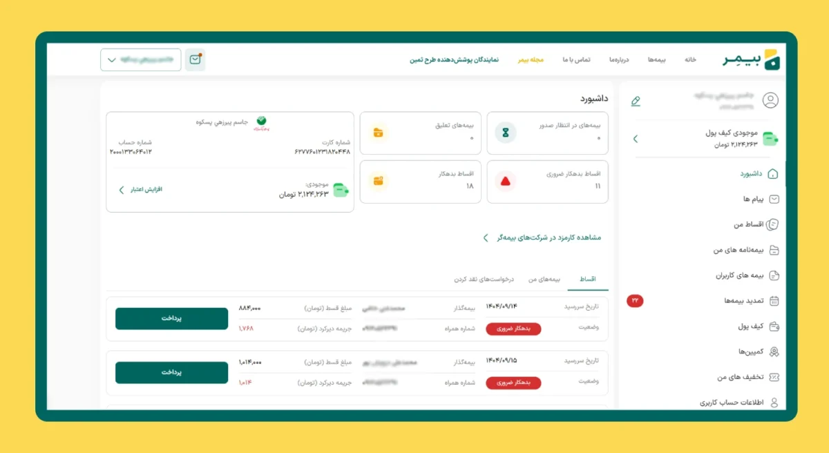 بعد از ورود به پنل بیمر، وارد صفحه داشبورد میشید. داشبورد، یک نمای کلی از وضعیت حساب و فعالیتهای شما رو نشون میده. در بالای صفحه، اطلاعات حساب کاربری شما نمایش داده شده؛ شامل نام کاربری و موجودی کیف پول. در این بخش میتونید موجودی فعلی خودتون رو ببینید و در صورت نیاز، برای افزایش اعتبار اقدام کنید. در قسمت وسط داشبورد، خلاصهای از وضعیت بیمهها نمایش داده میشه. این بخش به شما نشون میده چه تعداد بیمه در انتظار صدور هستن، چه بیمههایی تعلیق شدن و وضعیت اقساط به چه صورته. با استفاده از این کارتها، میتونید خیلی سریع متوجه بشید کدوم درخواستها نیاز به پیگیری دارن. در پایین صفحه، بخش «درخواستهای نقد کردن» قرار داره. در این قسمت میتونید درخواست های قبلی خودتون رو ببینید و وضعیت هر کدوم رو بررسی کنید؛ مثل در حال بررسی یا واریز شده. از منوی کناری پنل هم میتونید به بخشهای مختلف مثل بیمهنامهها، اقساط، کیف پول و پیامها دسترسی داشته باشید. داشبورد به شما کمک میکنه بدون نیاز به جستوجوی زیاد، وضعیت کلی حساب و فعالیتهاتون رو در یک نگاه مدیریت کنید. همچنین از قسمت مشاهده شرکتهای بیمهگر میتوانید میزان کیمسیون اختصاص داده شده برای هر بیمه گر رو ببینید.